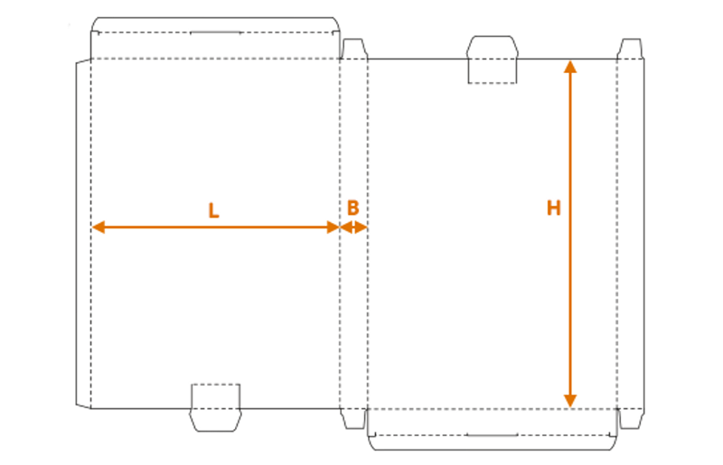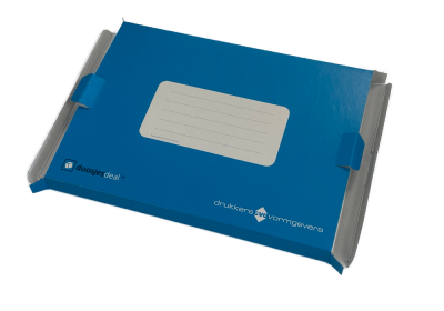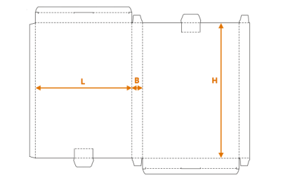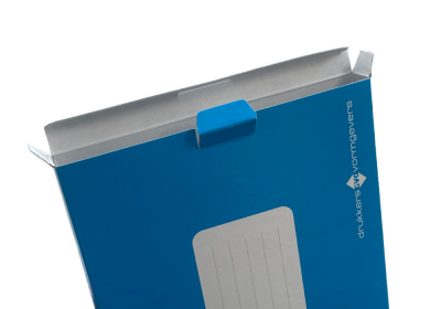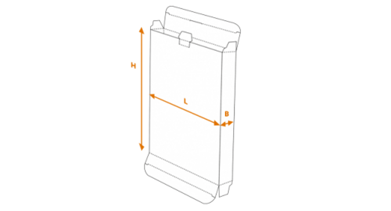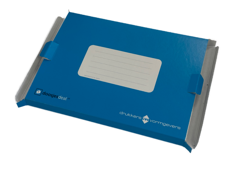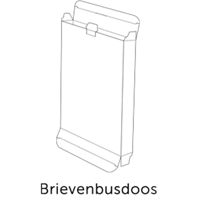 Doos voor het versturen van artikelen welke door een brievenbus moeten passen. Deze doos heeft een klepsluiting aan de onder- en bovenzijde welke apart worden vergrendeld. Gemaakt van een degelijke vouwkartonsoort, verkrijgbaar in verschillende maten. De doos wordt langsnaad gelijmd aangeleverd.