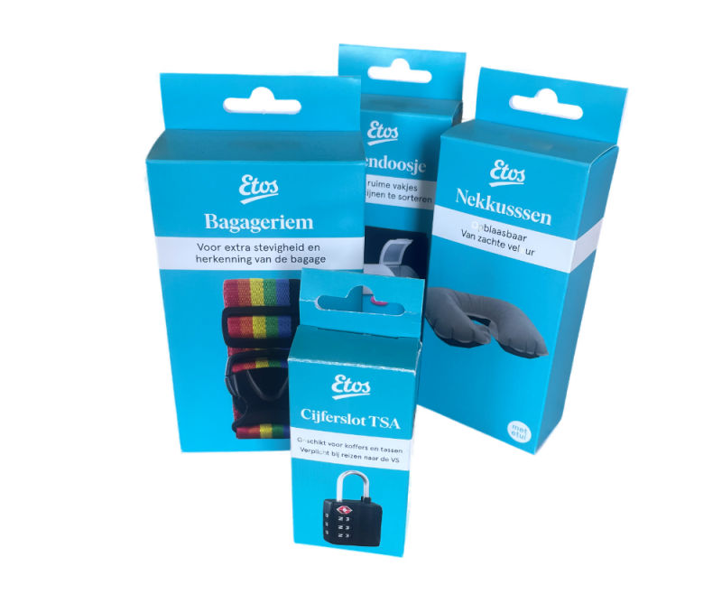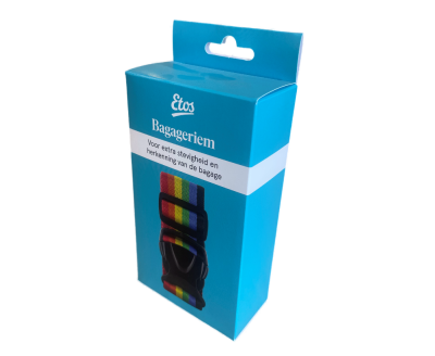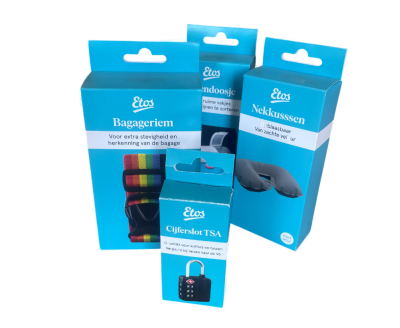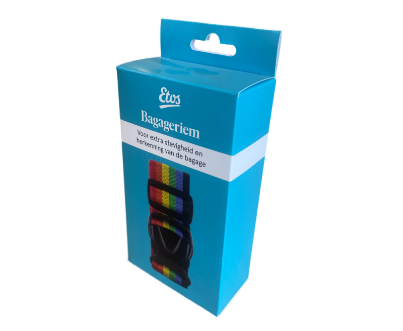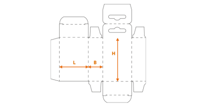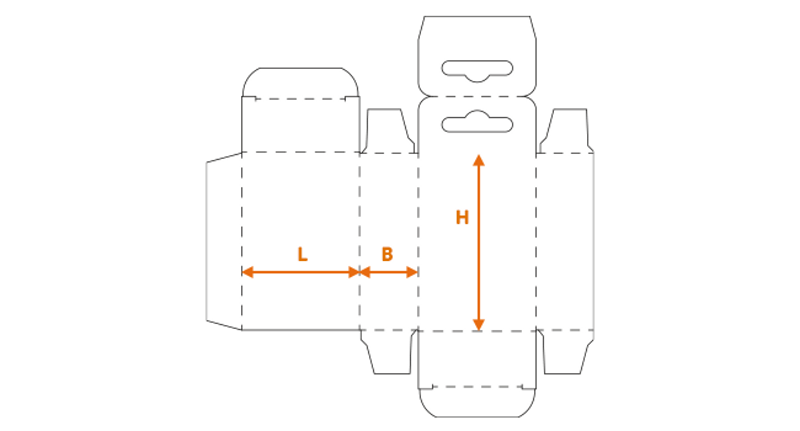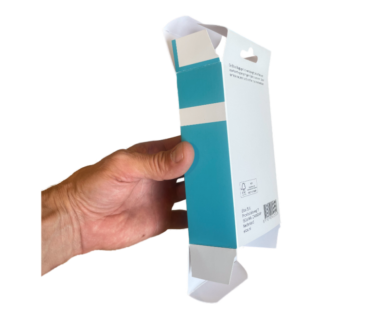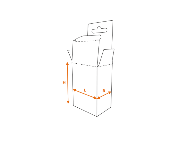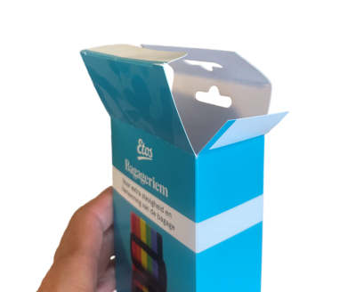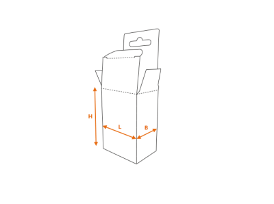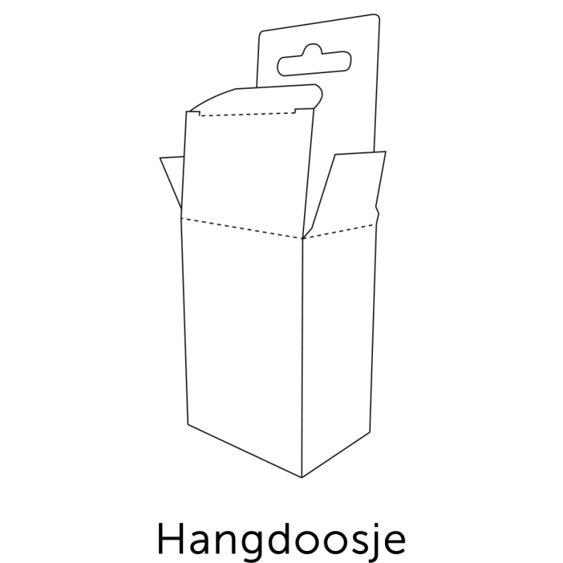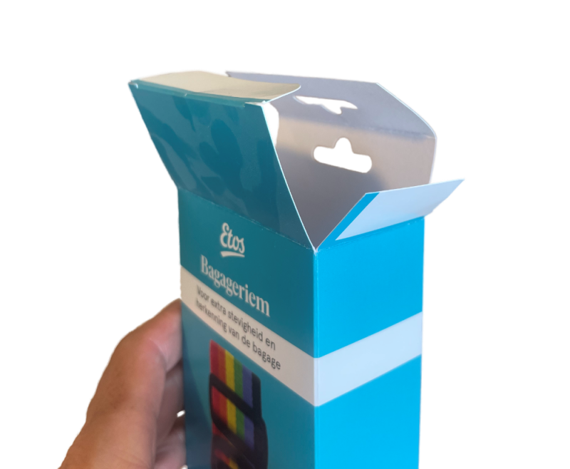Doosje met aan de bovenzijde een kartonnen flap voorzien van een euroslot / eurolock. Deze eurosleuf is te gebruiken om het doosje aan een rek ofpresentatiemolen op te hangen.