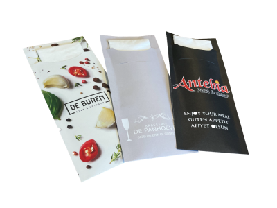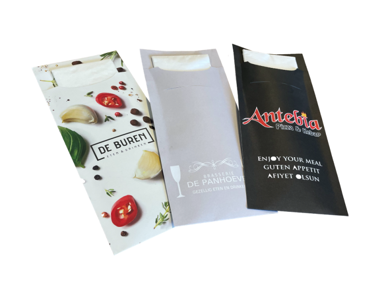 Servetzakjes met eigen ontwerp, standaard ontwerp of een leuk thema ontwerp. Voor iedere horeca gelegenheid een passend ontwerp. Ook verkrijgbaar met Kraft papier of gekleurde servetten.