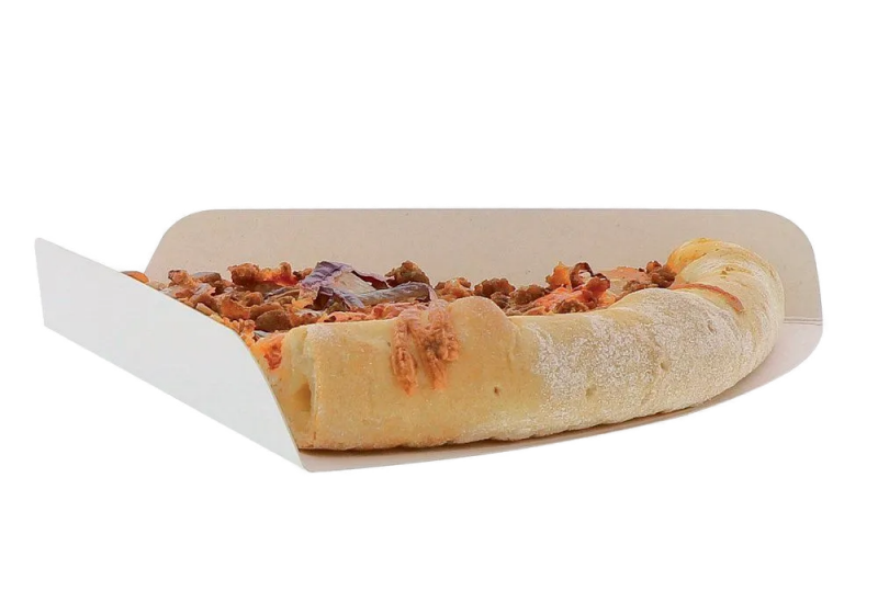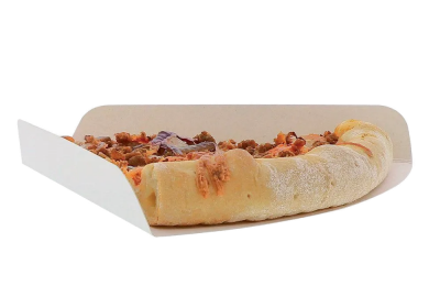 Deze pizzapunt houder kan gebruikt worden als meegeef verpakking voor een pizza slice (onder andere). Op deze manier voorkom je vlekken en voorkom je dat je de handen brandt. Tevens heb je de mogelijkheid je eigen huisstijl mee te geven. Als je de binnenzijde wilt bedrukken adviseren we voor laminaat te kiezen.