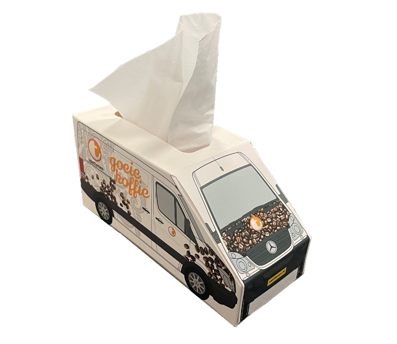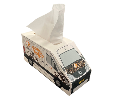 Deze handige tissue box snel en voordelig voorzien van je eigen bedrukking. Naast de gewone rechthoekige variant zijn er verschillende creatieve modellen; een kubus, een zeshoek of zelfs een bestelbus, vrachtauto of container met je eigen tekst en logo erop. Een ideale give-away, promotieartikel voor op een bureau, in een wachtkamer, op de balie of voor onderweg in de auto. De box wordt geleverd inclusief 60 chique 3-laags tissues.